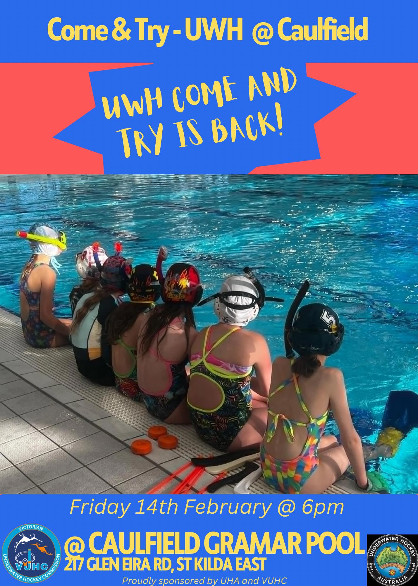 Come & Try UNDERWATER HOCKEY, IT’s FREE!!!!! February 10, 2025 vuhc We’re back at Caulfield and we are offering the first 4 sessions free for new comers!
